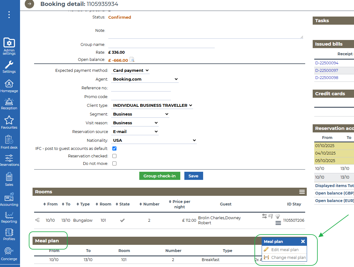 Useful tip: Edit/Change meal plan function, available in Room detail, amends meal plan for that particular room.