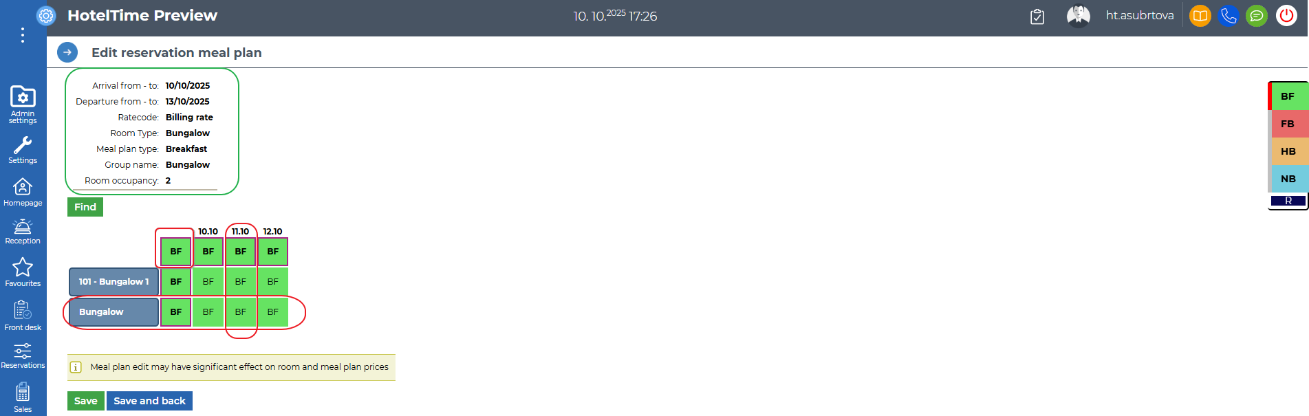 4. Edit/Change meal plan for selected dates / rooms: