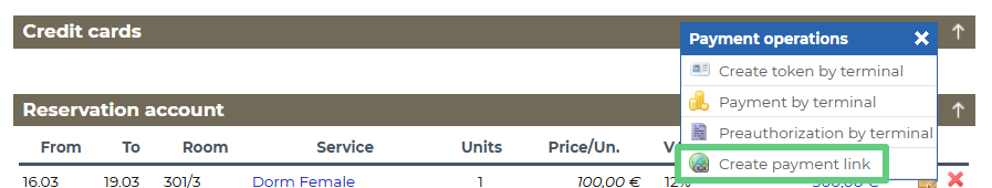 In the reservation or room detail, go to the Credit Cards section and click on Create Payment Link.