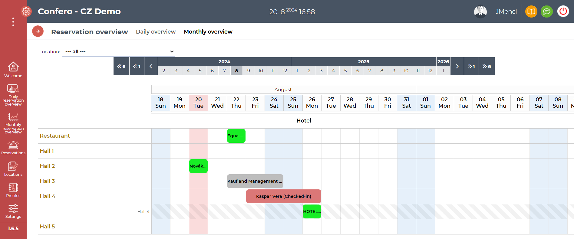 The monthly overview provides an instant overview of bookings for 30 days ahead. Days are shown on the timeline. By clicking into the overview, you can instantly create a new booking at the selected location (all that's left to do is select the location layout).