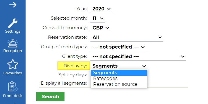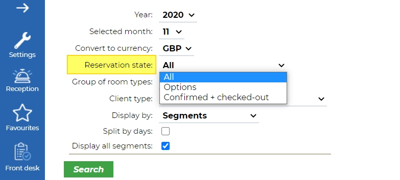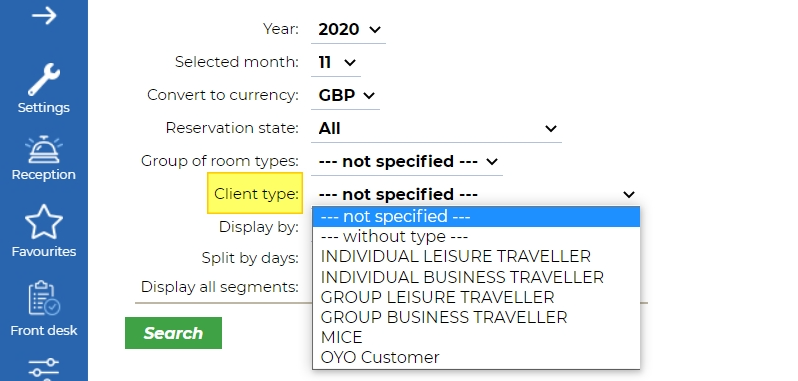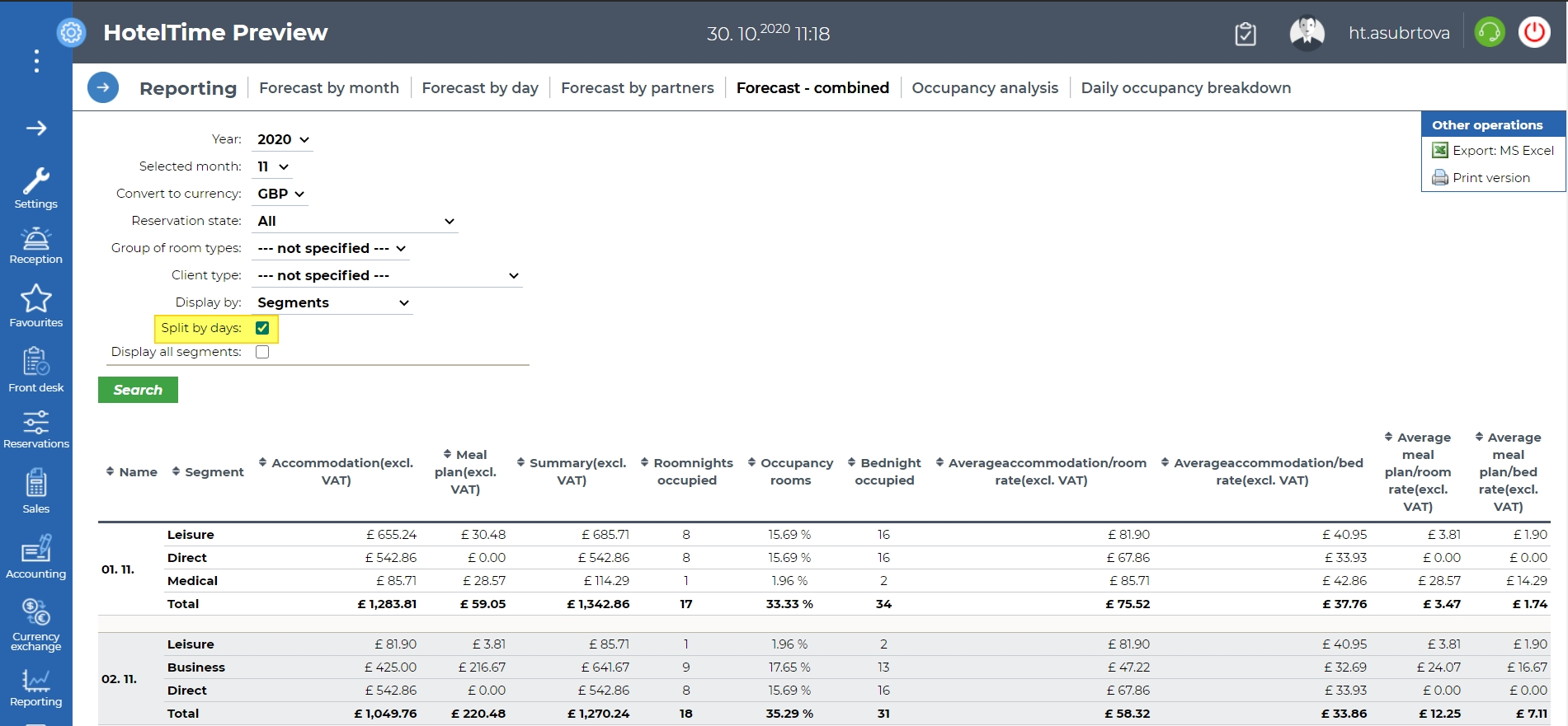 This forecast is a combination of other forecasts and shows a few extra data. You can filter by reservation status, group of room types, client type, by segments, rate codes etc. It can be splited by days and possibly displays all segments.