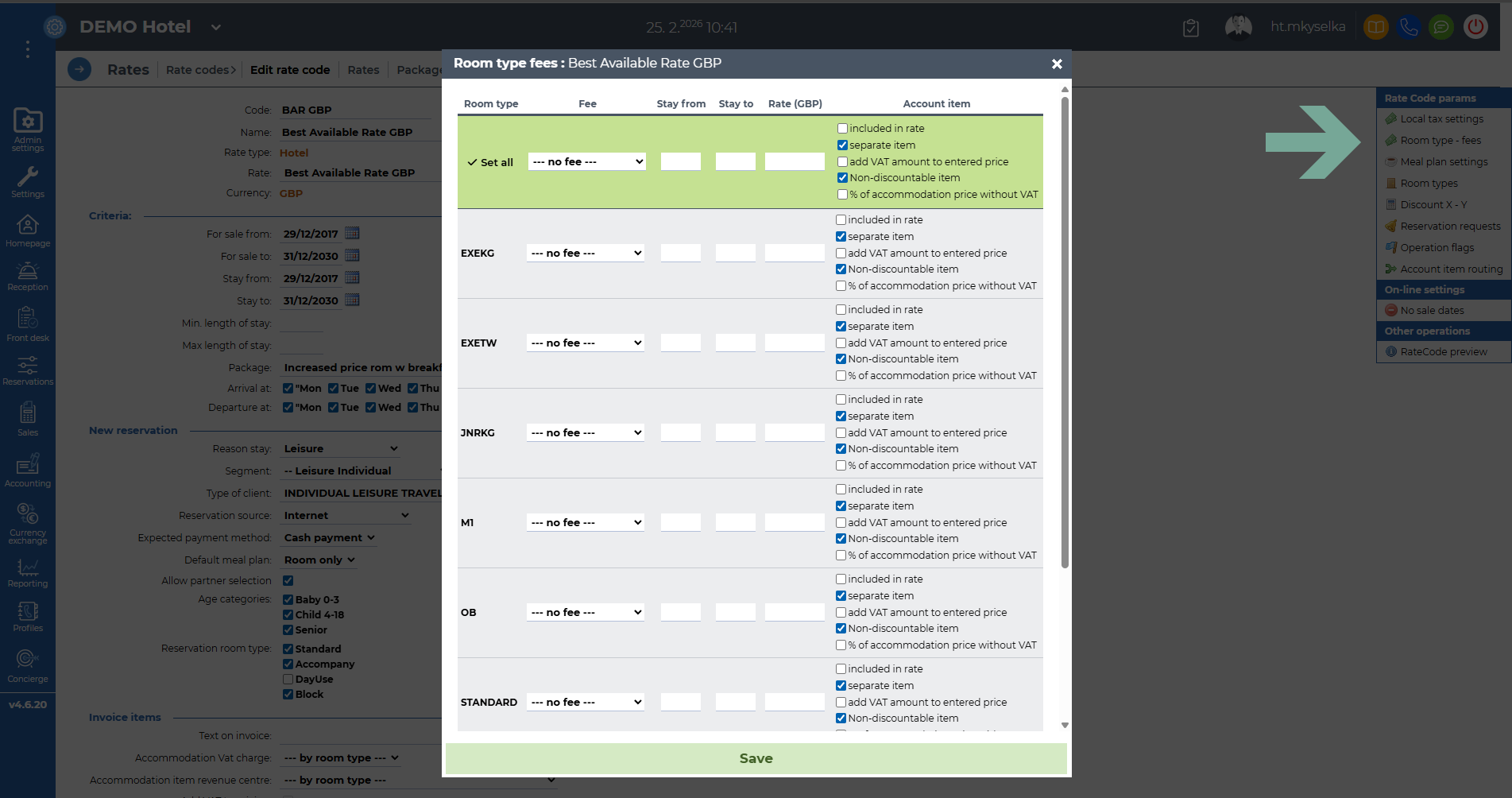 After selecting a specific RateCode, click on Room type - fees on the right side.