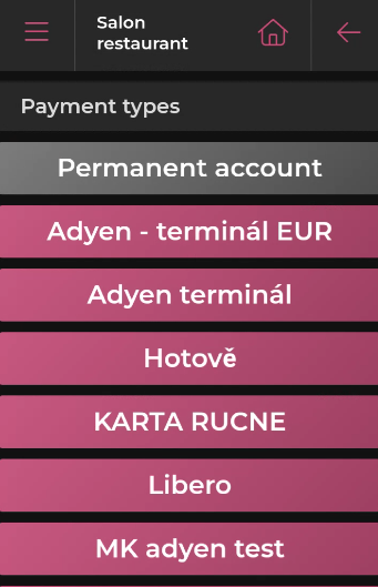 Info: In the mobile app, the available payment types include Cash, Adyen Card, HotelTime, and payments with the User target. In Vento, you can find the list of payment methods under Settings – Payment Methods.