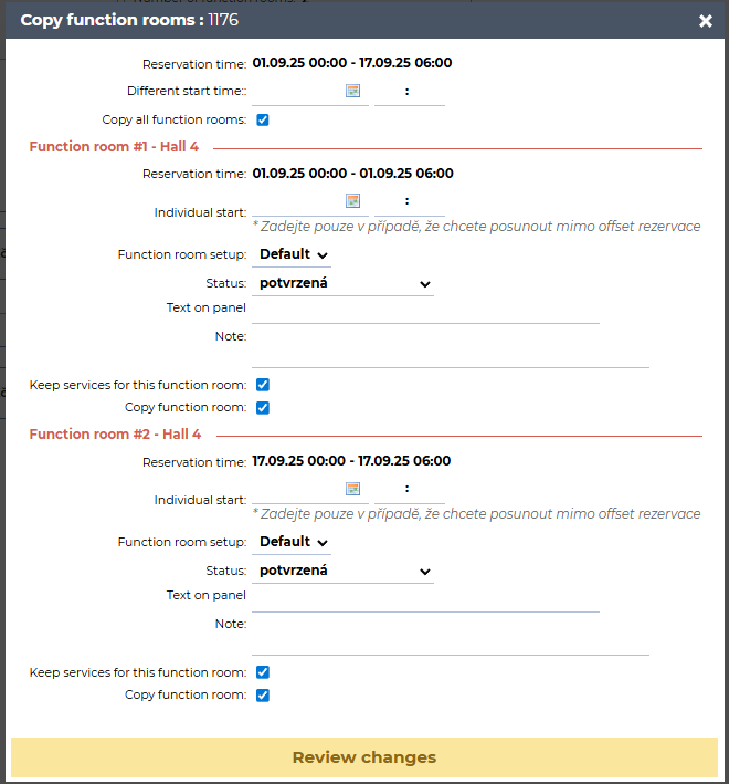 You can also choose whether to copy all function rooms or only selected ones. Similarly, you can decide whether only function rooms will be copied, or rooms together with services (equipment, catering, etc.).